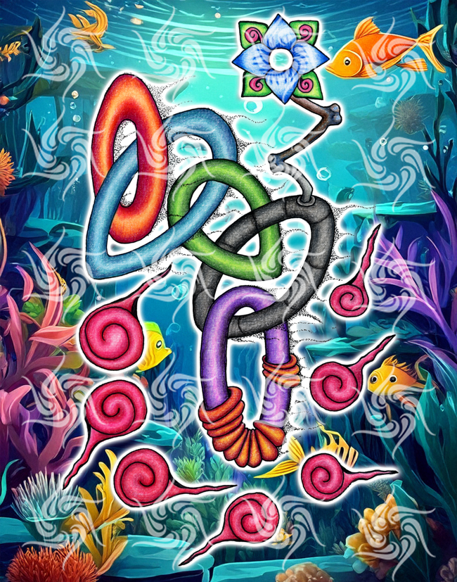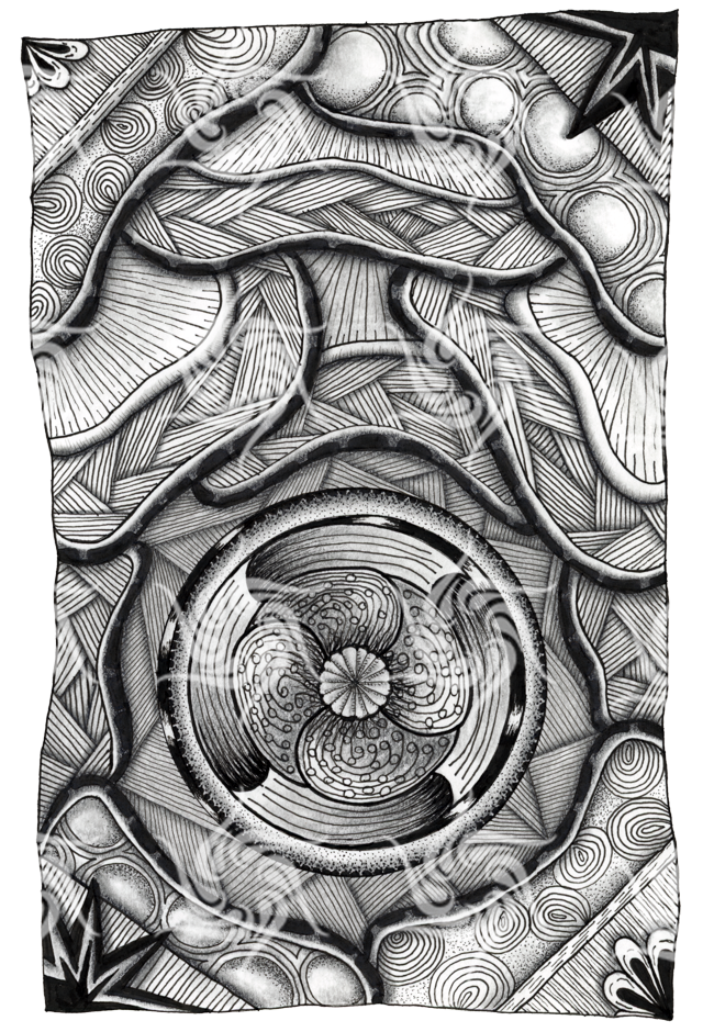 I have three processes. The first is entirely hand-drawn, using ink, graphite, alcohol markers, and colored pencils on paper. These tactile materials ground the work in human touch and imperfection, while the designs themselves open portals to the infinite. The imagery is both organic and cosmic — earthy textures merging with alien symmetry, ancient motifs converging with contemporary vision.